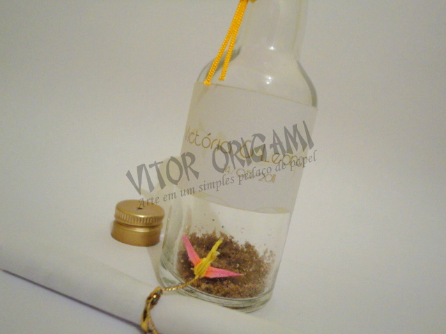 Dentro da garrafa tem um tsuru,o convite em si e um pouco de areia,do jeito que a Victória pediu.No exterior da garrafa,um ''encarte'' com o nome dos noivos e a data.